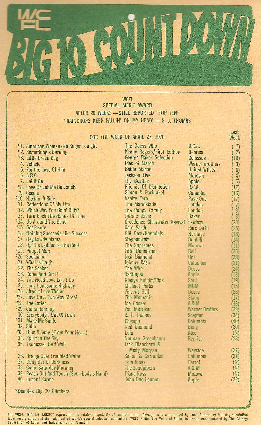 WCFL SPECIAL MERIT AWARD - AFTER 20 WEEKS--STILL REPORTED "TOP TEN" -- "RAINDROPS KEEP FALLING ON MY HEAD--B.J. THOMAS
