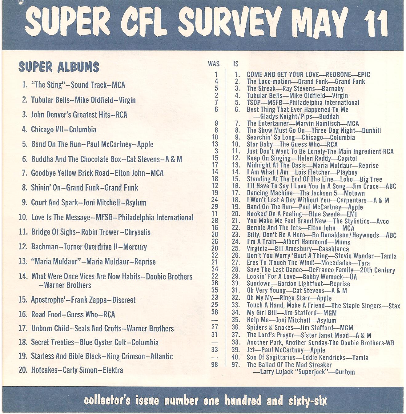 WCFL-AM, Chicago, Ill. SUPER CFL SURVEY MAY 11, 1974