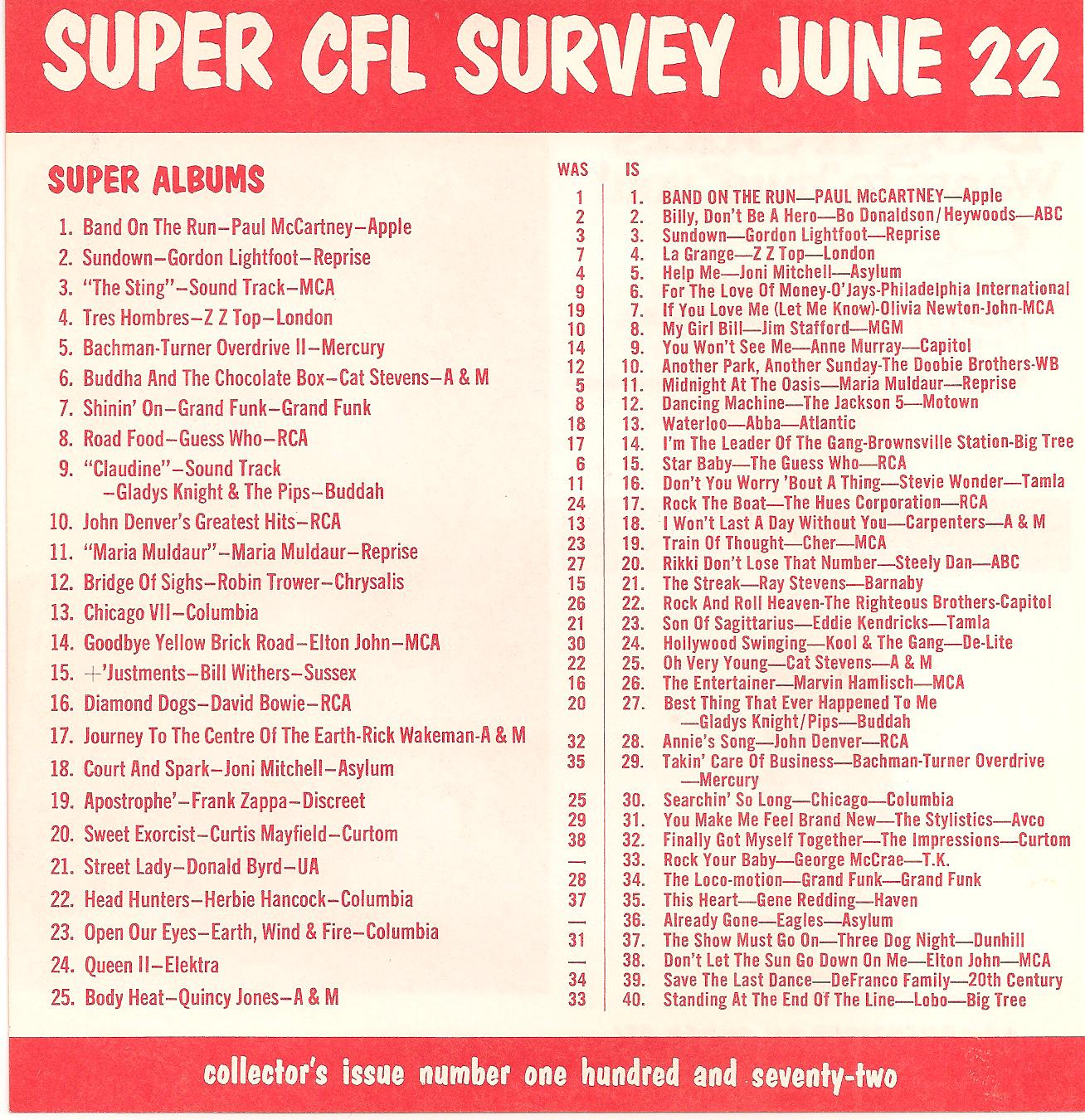 WCFL-AM, Chicago, Ill. SUPER CFL SURVEY JUNE 22, 1974