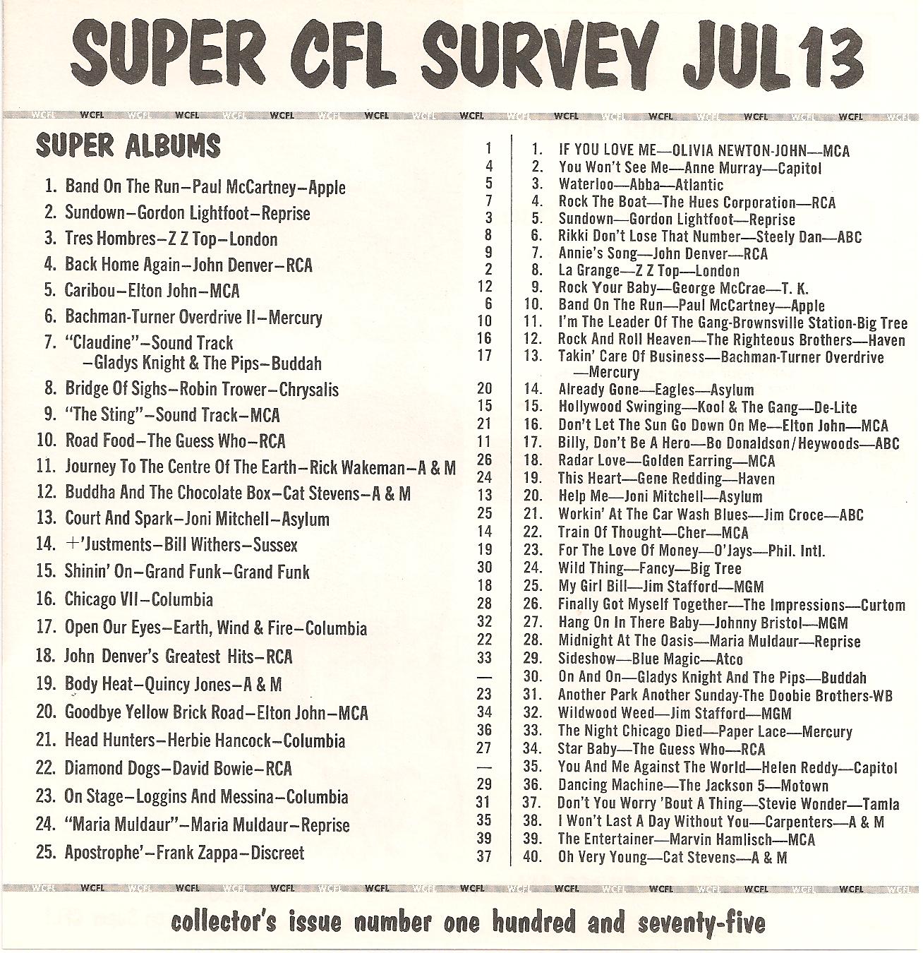 WCFL-AM, Chicago, Ill. SUPER CFL SURVEY JULY 13, 1974