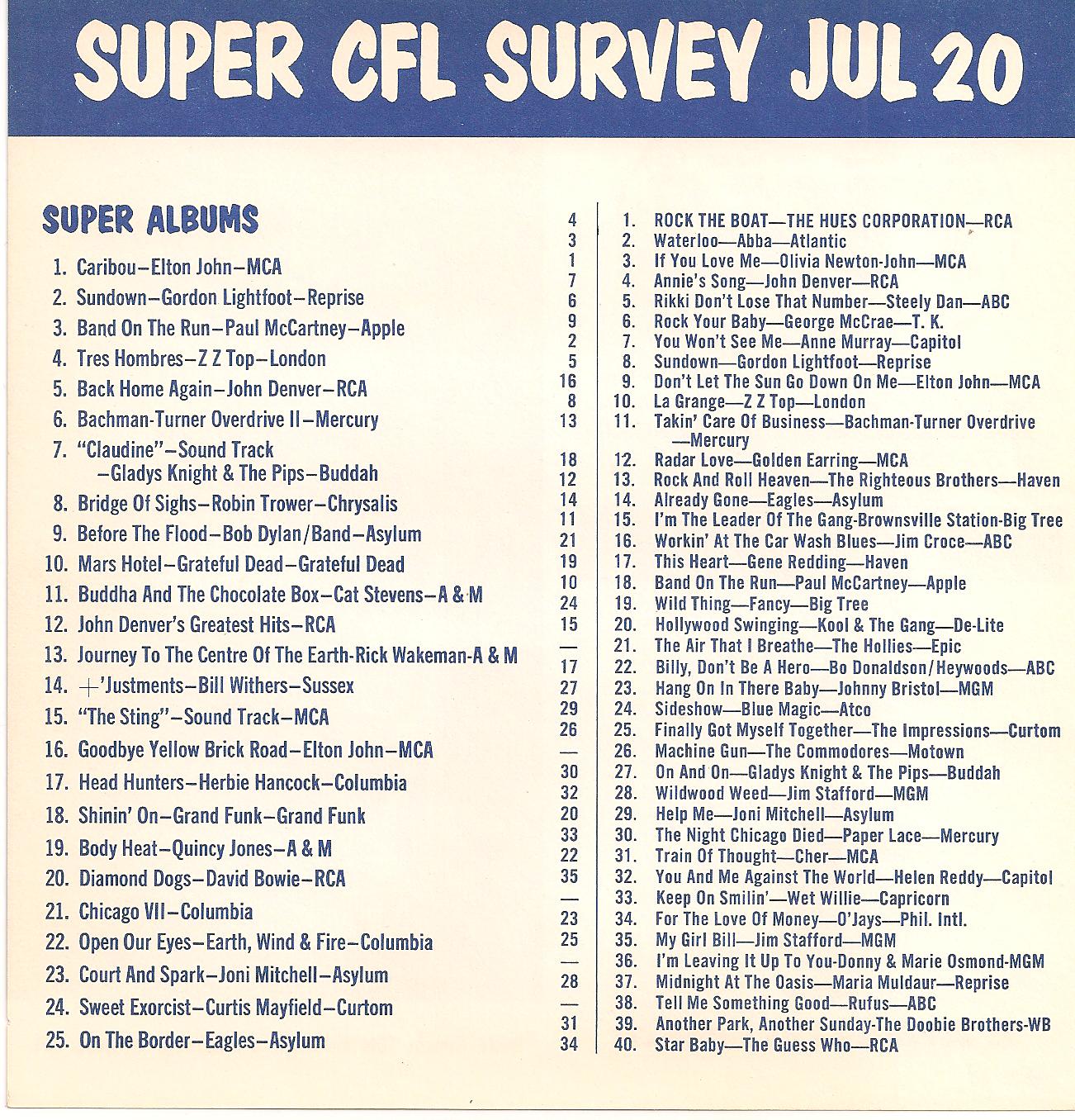 WCFL-AM, Chicago, Ill. SUPER CFL SURVEY JULY 20, 1974