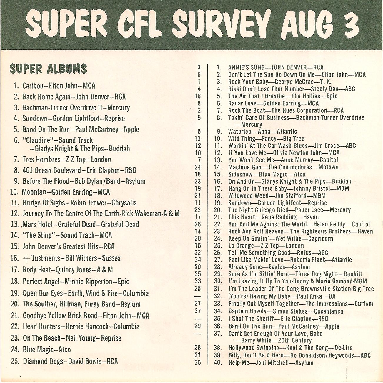 WCFL-AM, Chicago, Ill. SUPER CFL SURVEY AUG 3, 1974