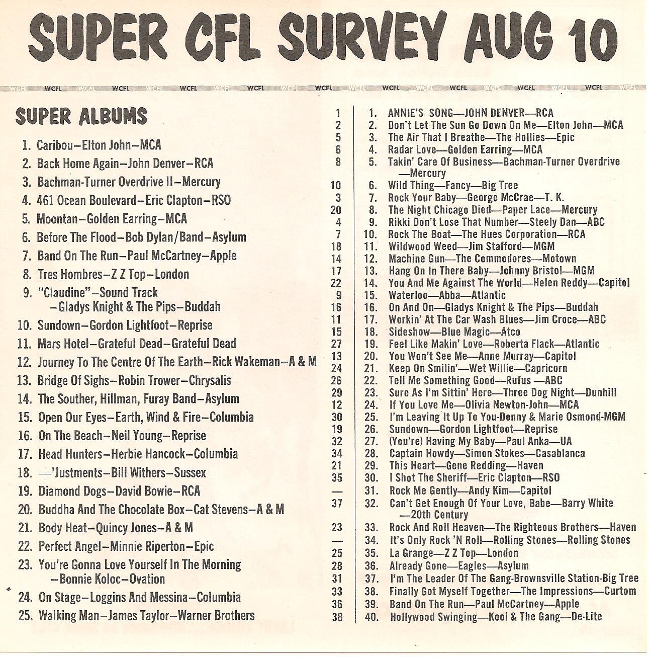 WCFL-AM, Chicago, Ill. SUPER CFL SURVEY AUG 10, 1974