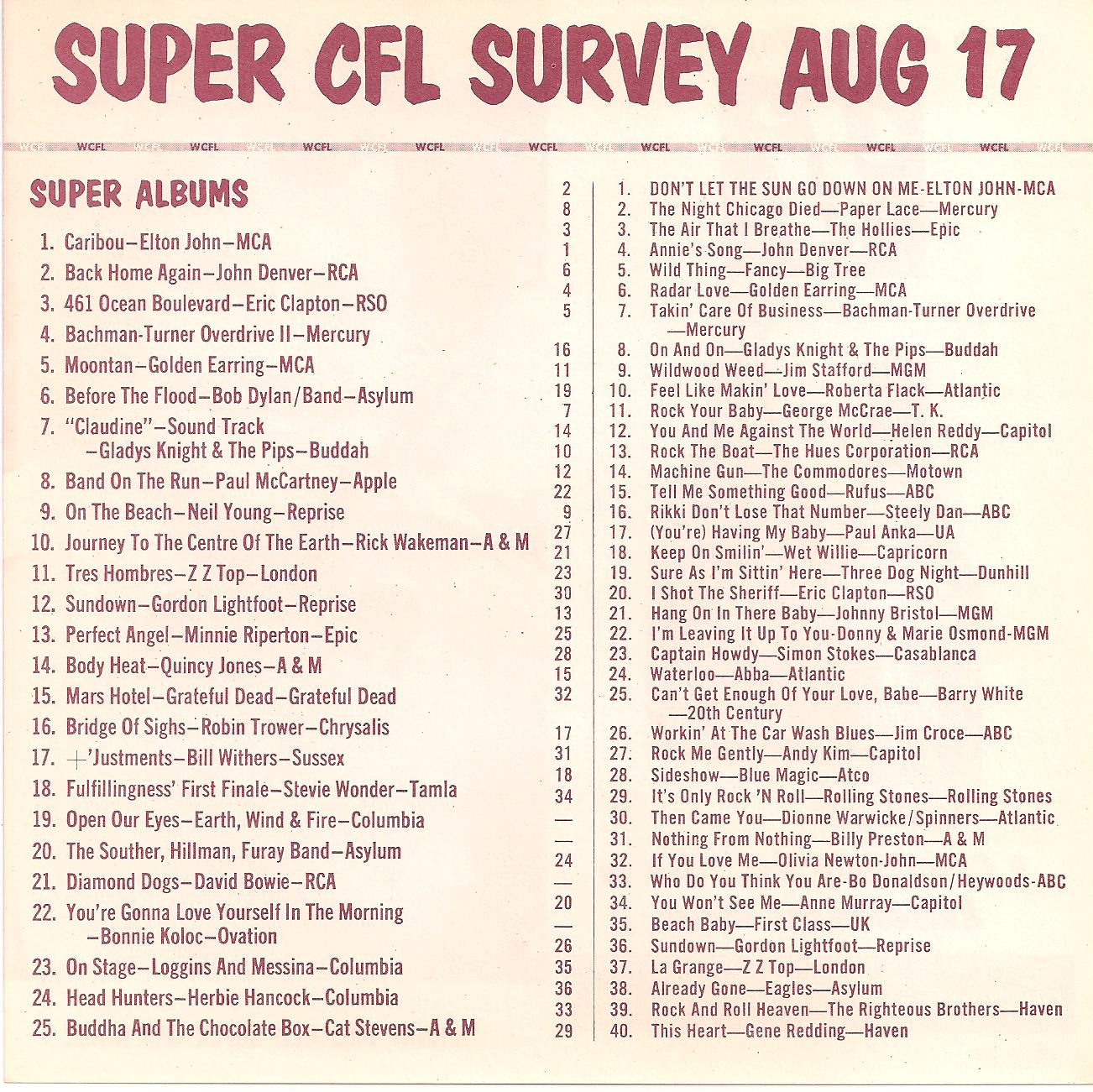 WCFL-AM, Chicago, Ill. SUPER CFL SURVEY AUG 17, 1974