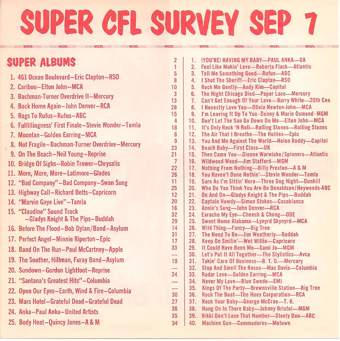 WCFL-AM, Chicago, Ill. SUPER CFL SURVEY SEP 7, 1974