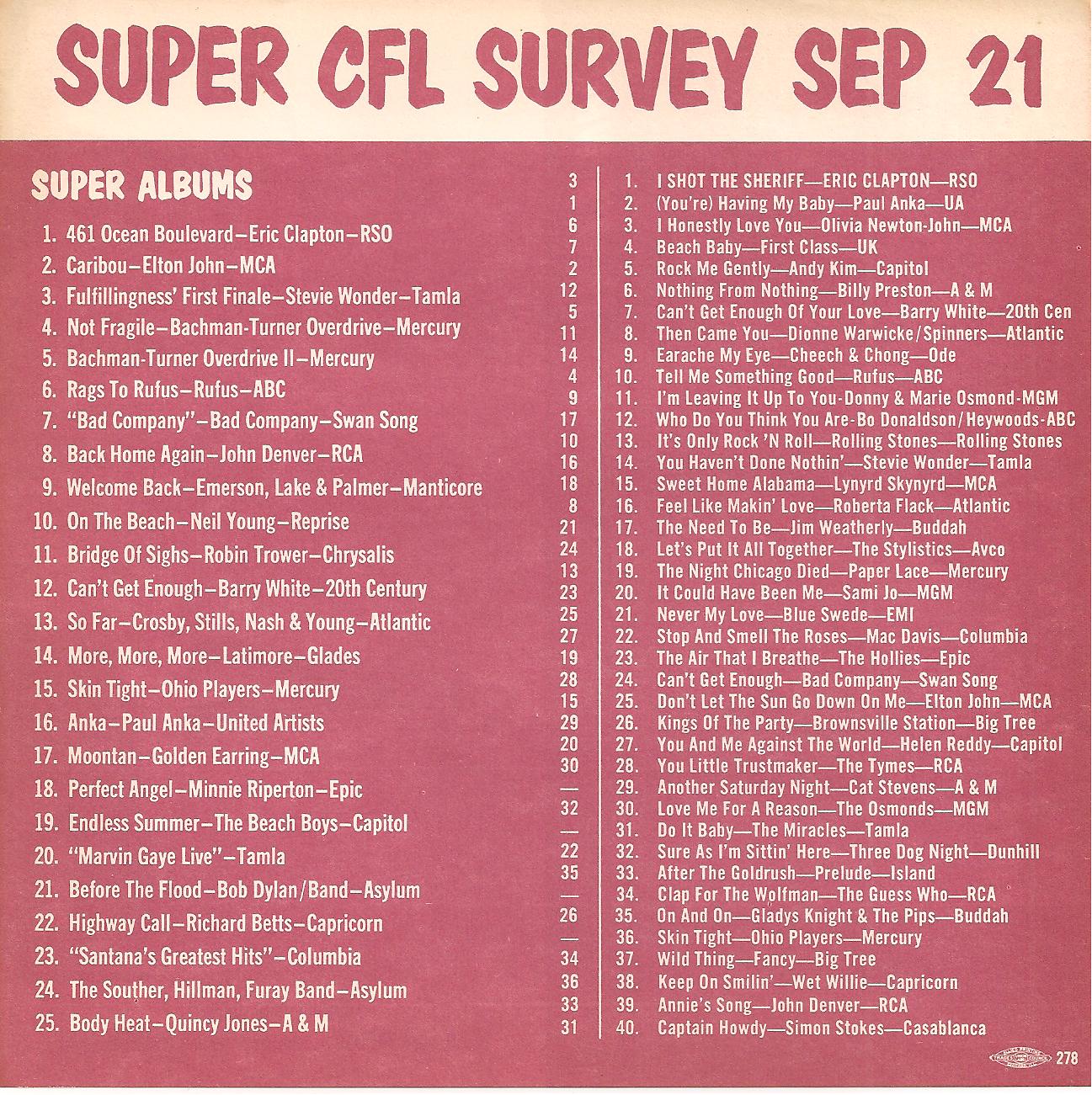 WCFL-AM, Chicago, Ill. SUPER CFL SURVEY SEP 21, 1974
