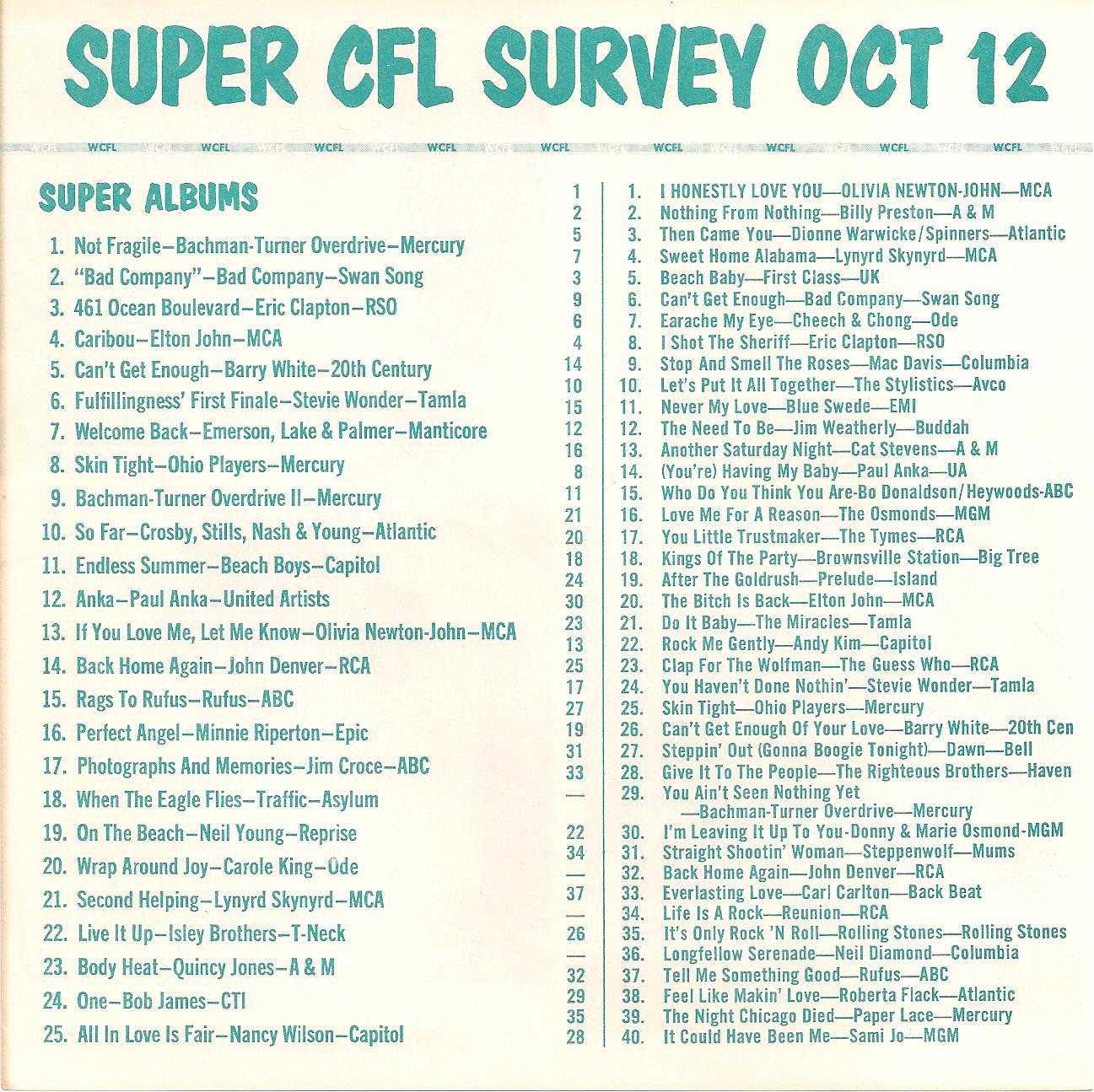 WCFL-AM, Chicago, Ill. SUPER CFL SURVEY OCT 12, 1974