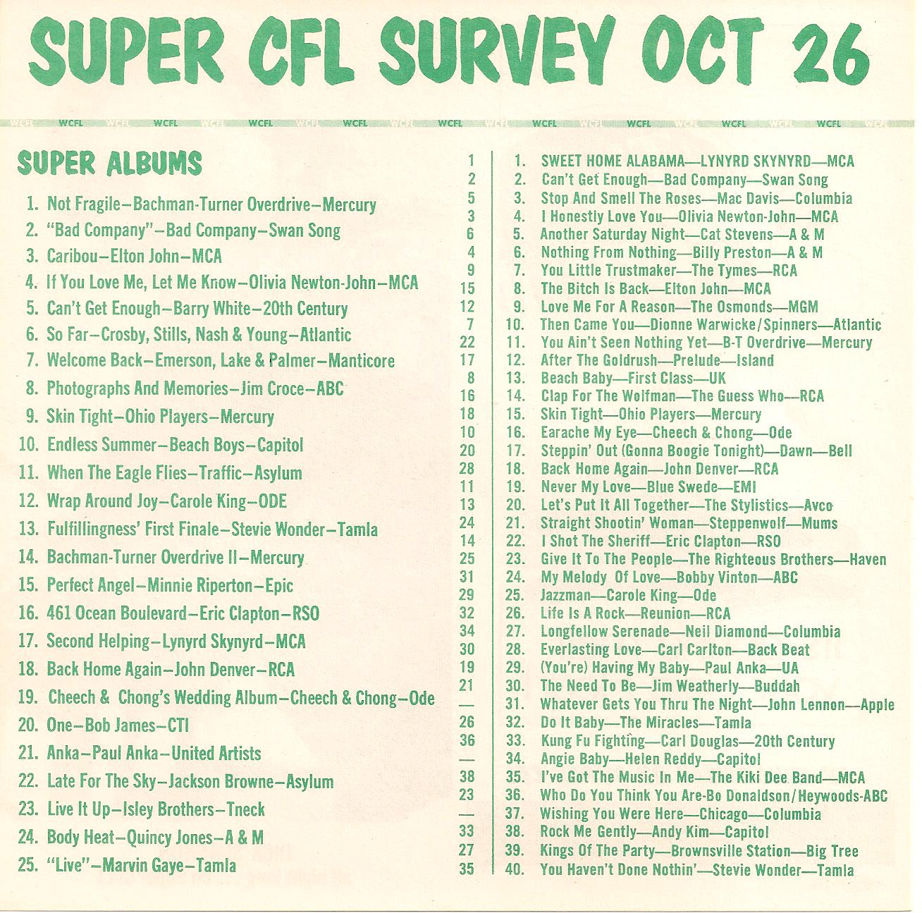 WCFL-AM, Chicago, Ill. SUPER CFL SURVEY OCT 26, 1974