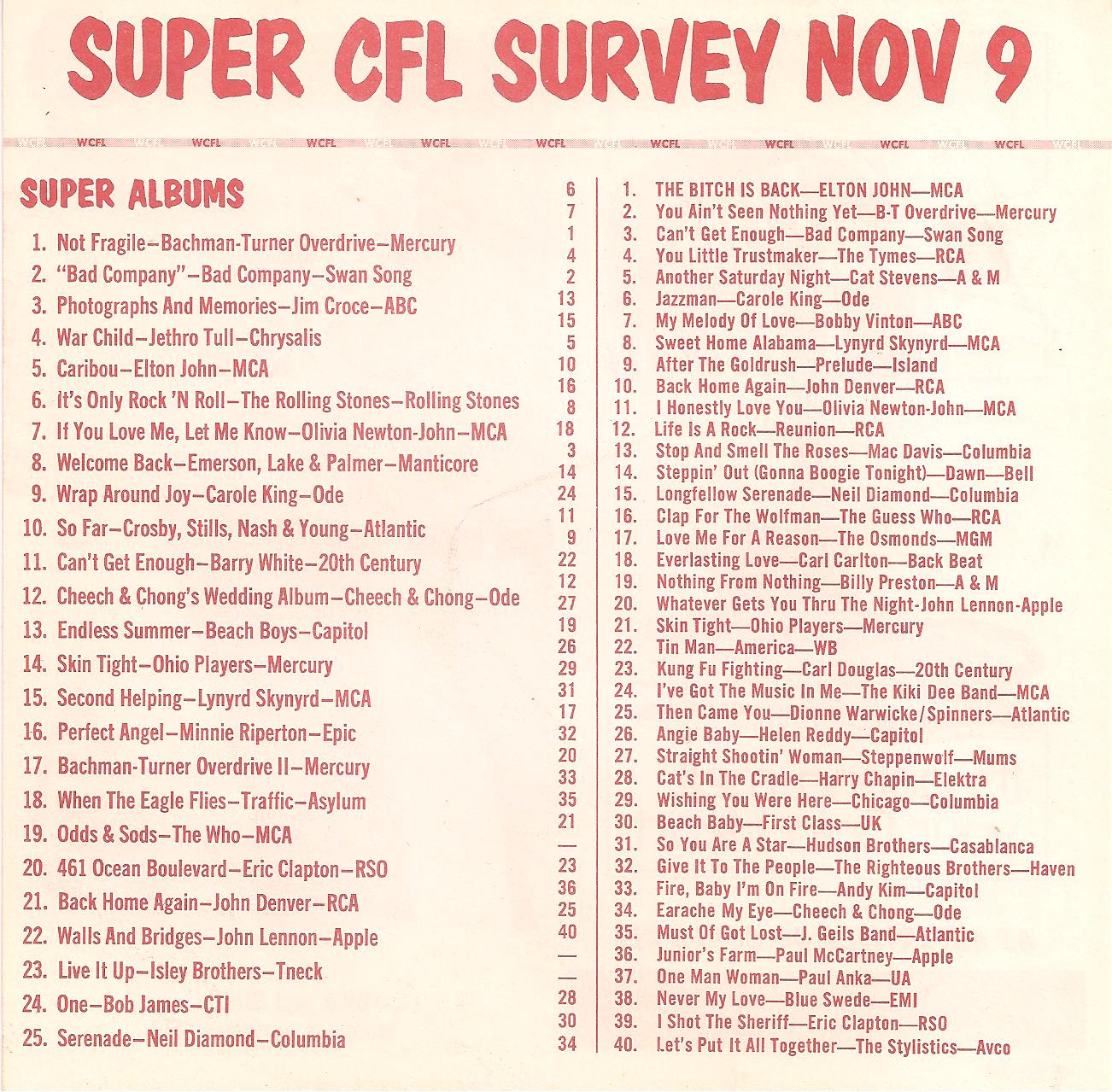 WCFL-AM, Chicago, Ill. SUPER CFL SURVEY NOV 9, 1974