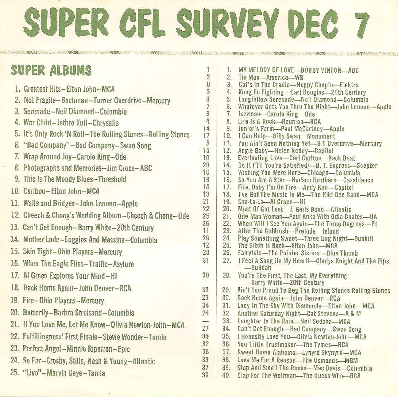 WCFL-AM, Chicago, Ill. SUPER CFL SURVEY DEC 7, 1974